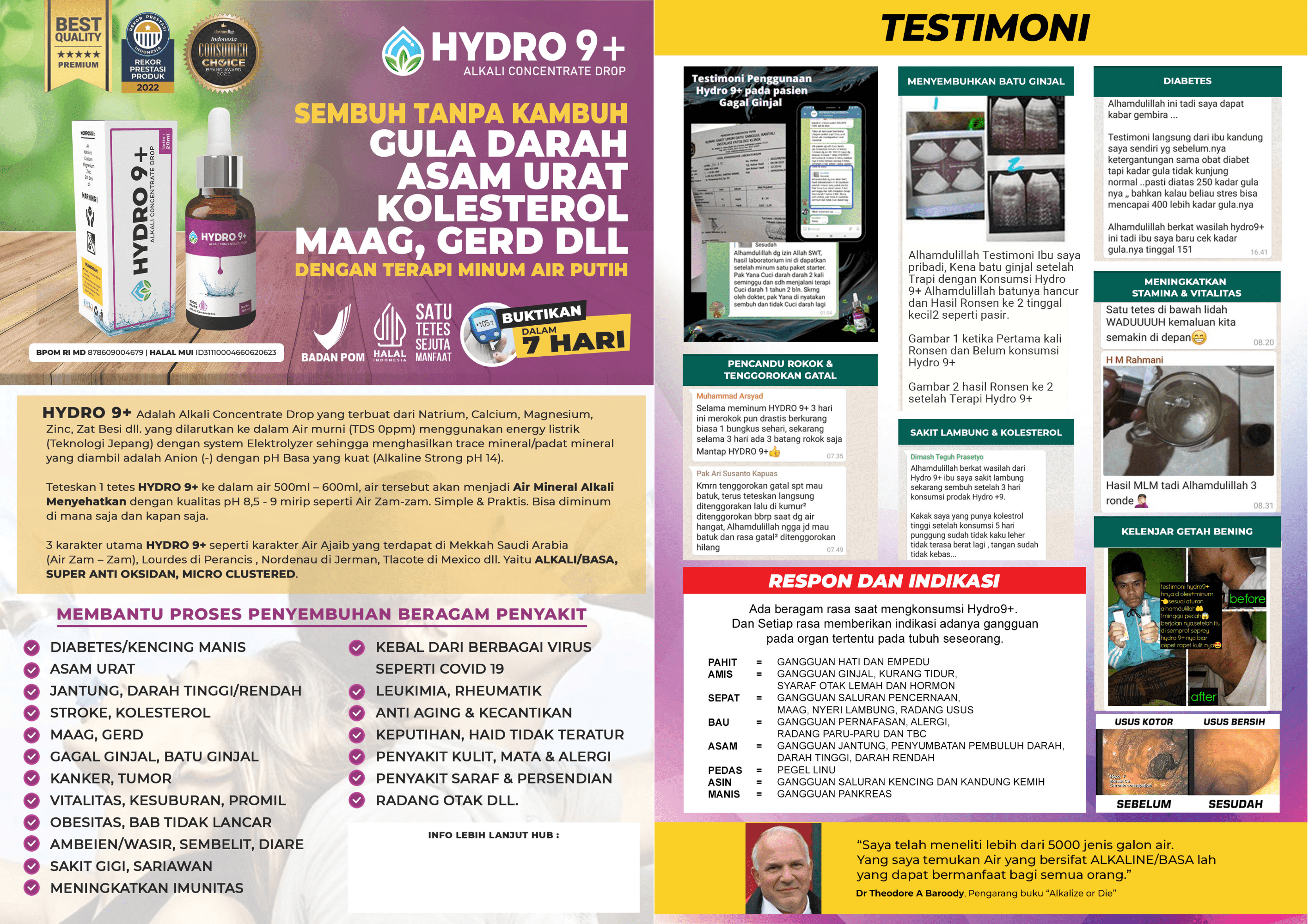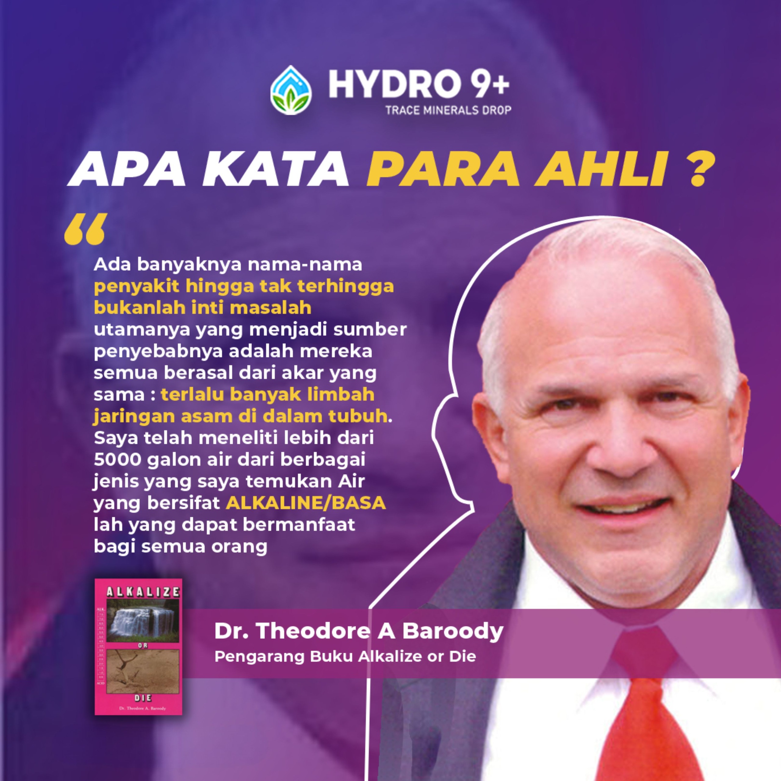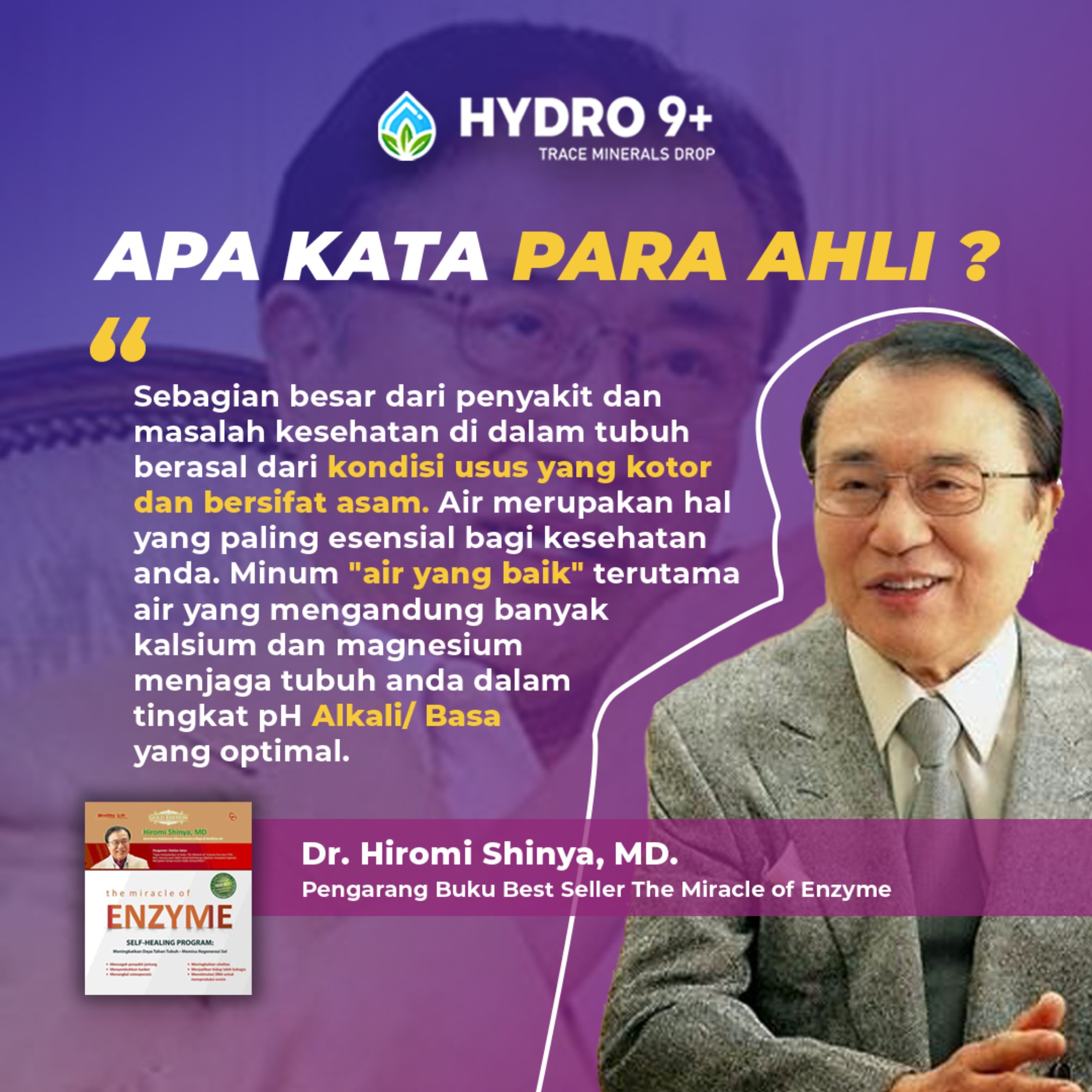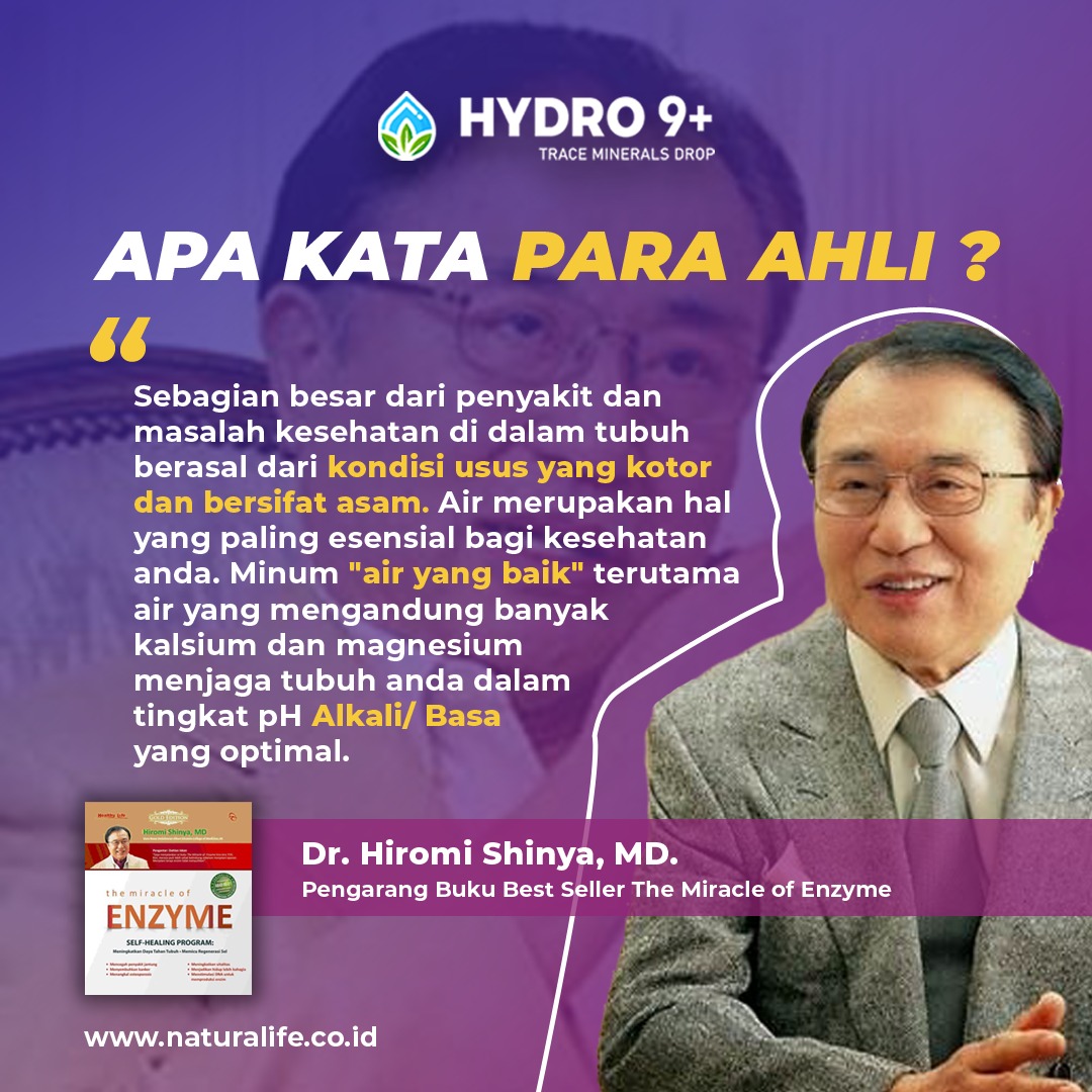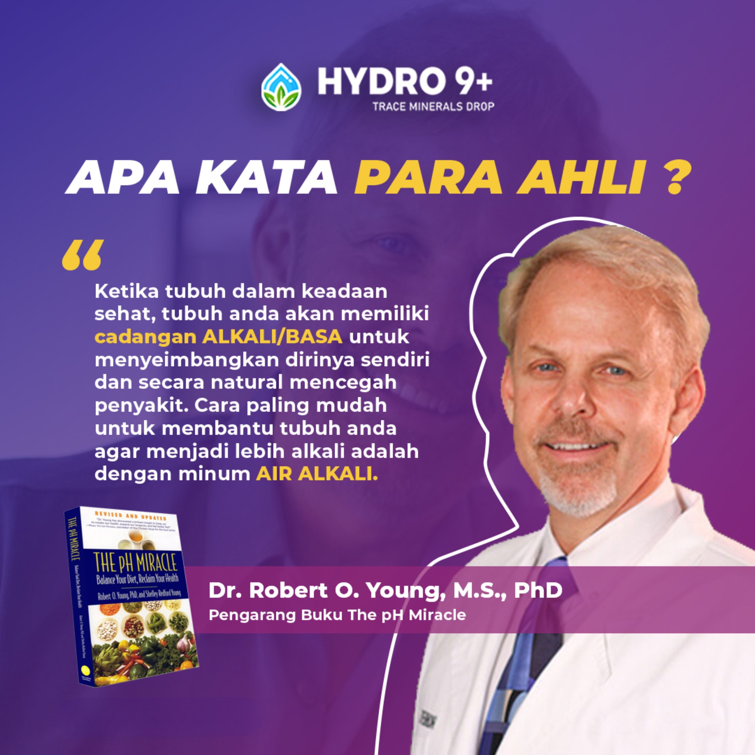 HYDRO9+ bukan obat. HYDRO9+ adalah Biang Alkali yang berbahan dasar alami Mineral ALKALI Grade A (Istimewa), Natrium, Calcium, Magnesium, Zinc, Zat Besi dll.
